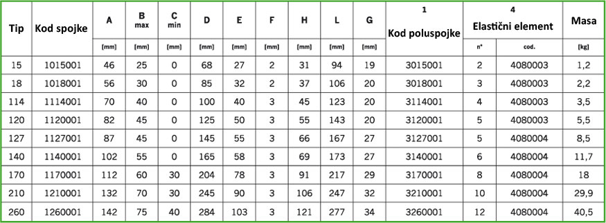 Ovaj tip spojke omogućuje apsorciju udara i torzionih vibracija zahvaljujući posebnim elastičnim okruglim umetcima koji rade pod tlačnim silama. |